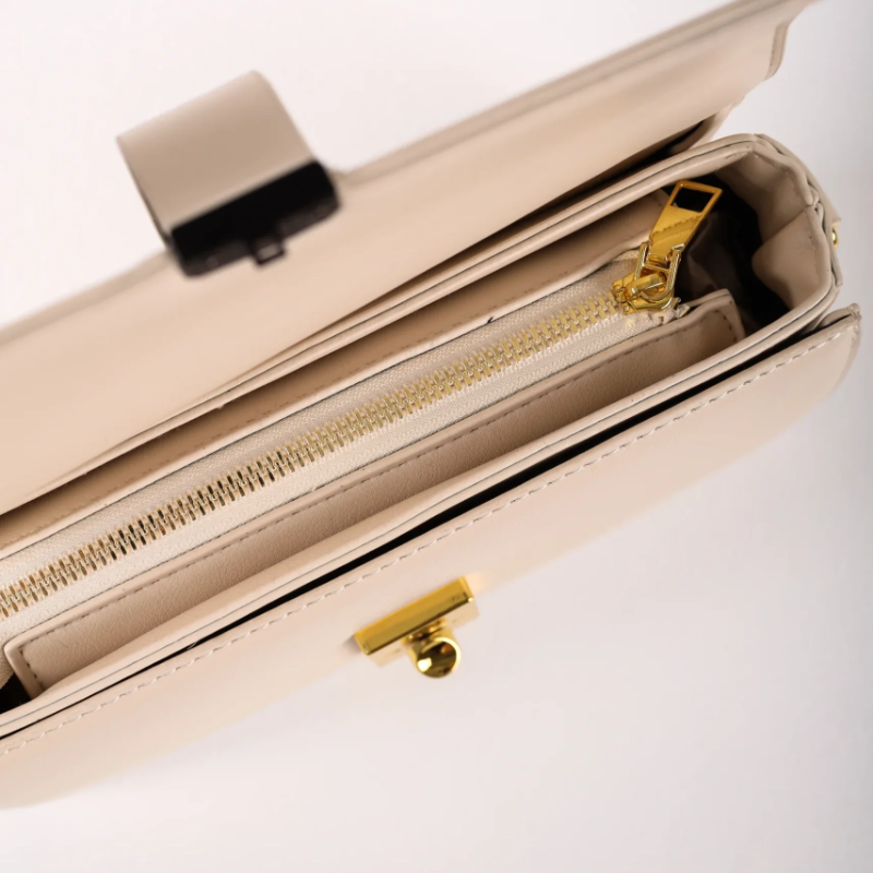 Zlatni detalji unose dozu profinjenosti, dok dimenzije torbice omogućavaju nošenje svih osnovnih potrepština – poput telefona, novčanika i ključeva. Zahvaljujući neutralnoj boji i modernim linijama, ovaj model lako se uklapa u poslovne, urbane i ležerne kombinacije.