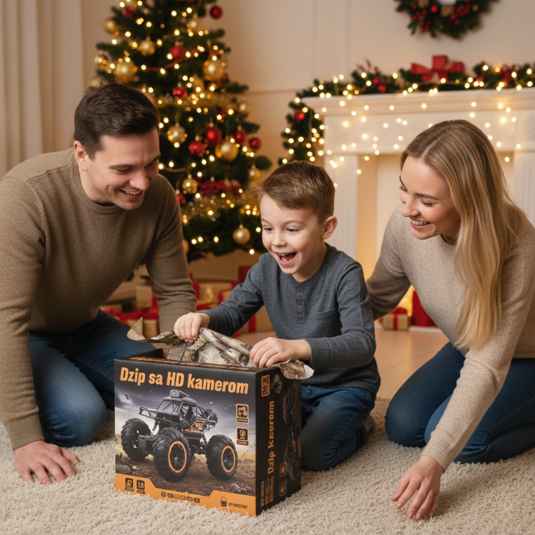 Ovaj džip je jedan od onih poklona koji se odmah otvore, uključe i ne ispuštaju iz ruku. Klinci ga obožavaju jer nudi vožnju, kameru i avanturu u jednom, pa praznici postaju još uzbudljiviji i zabavniji.