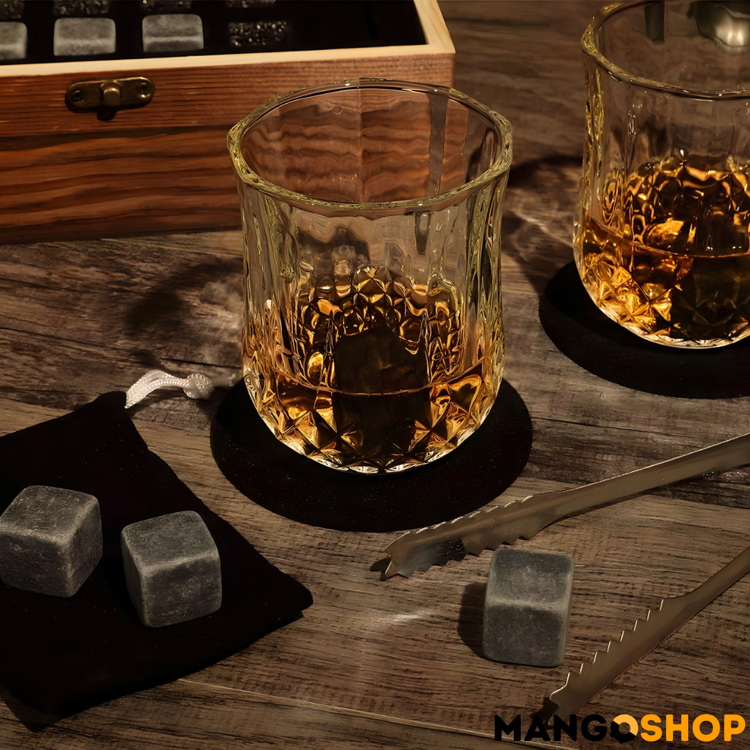 Ovaj set nije samo vizuelno impresivan – on pruža pravo uživanje. Čaše su oblikovane tako da naglase aromu svakog gutljaja, dok rashladni kamenčići čuvaju ukus viskija – bez razvodnjavanja kao kod običnog leda.