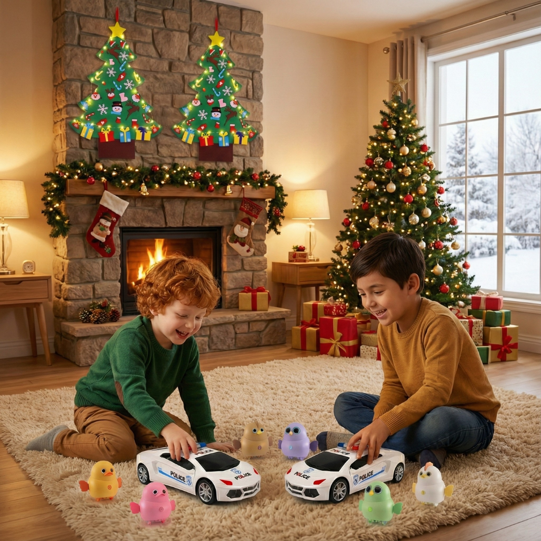 Filc jelka sa ukrasima, policijski autić sa svetlom i zvukom, 3 vesela pileta |