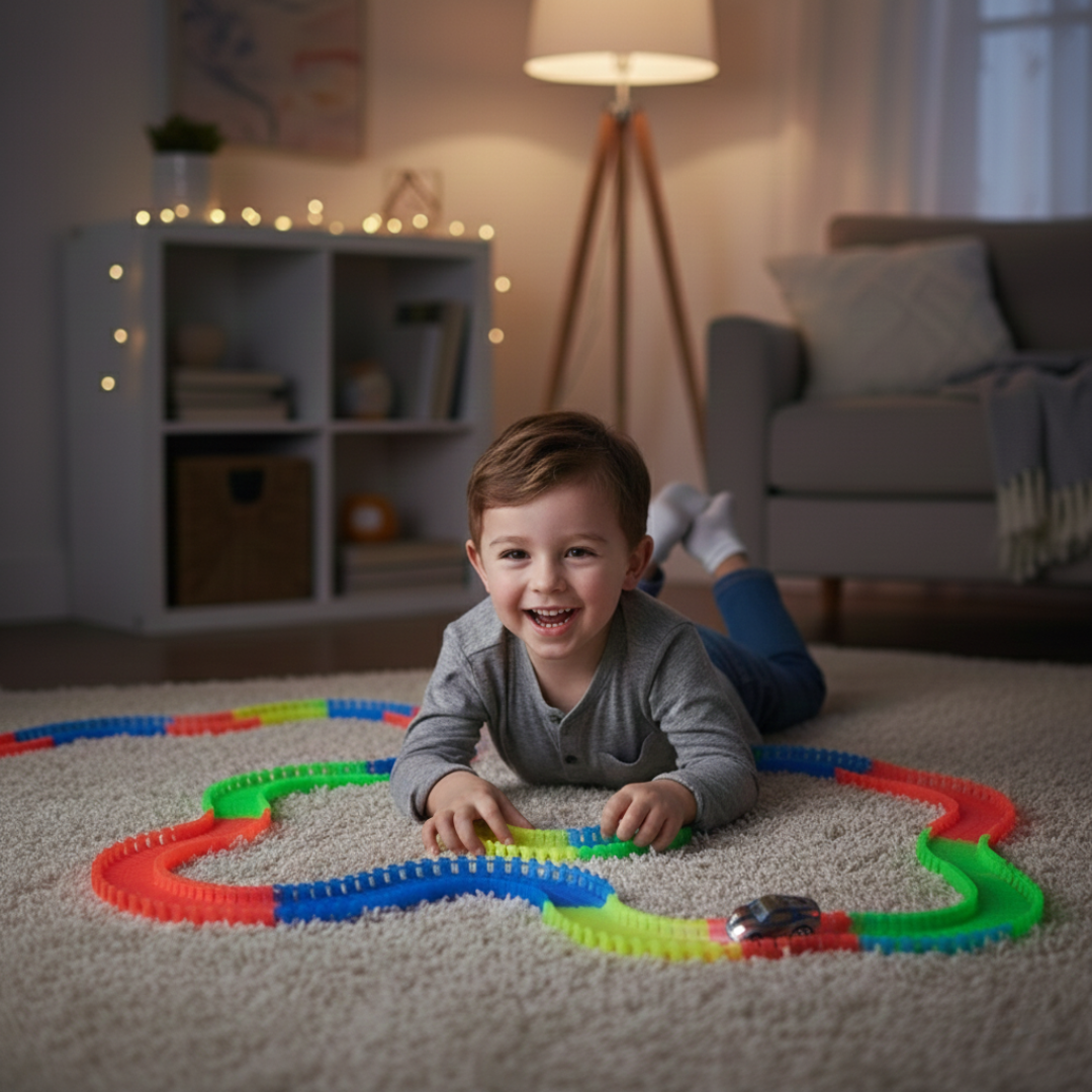Turbo Glow Trkački Set je igračka koja spaja kretanje, maštu i svetlosni efekat koji decu potpuno uvlači u igru. Staza se savija, produžava i prilagođava prostoru, pa svaka nova postavka postaje nova trka i novo uzbuđenje.